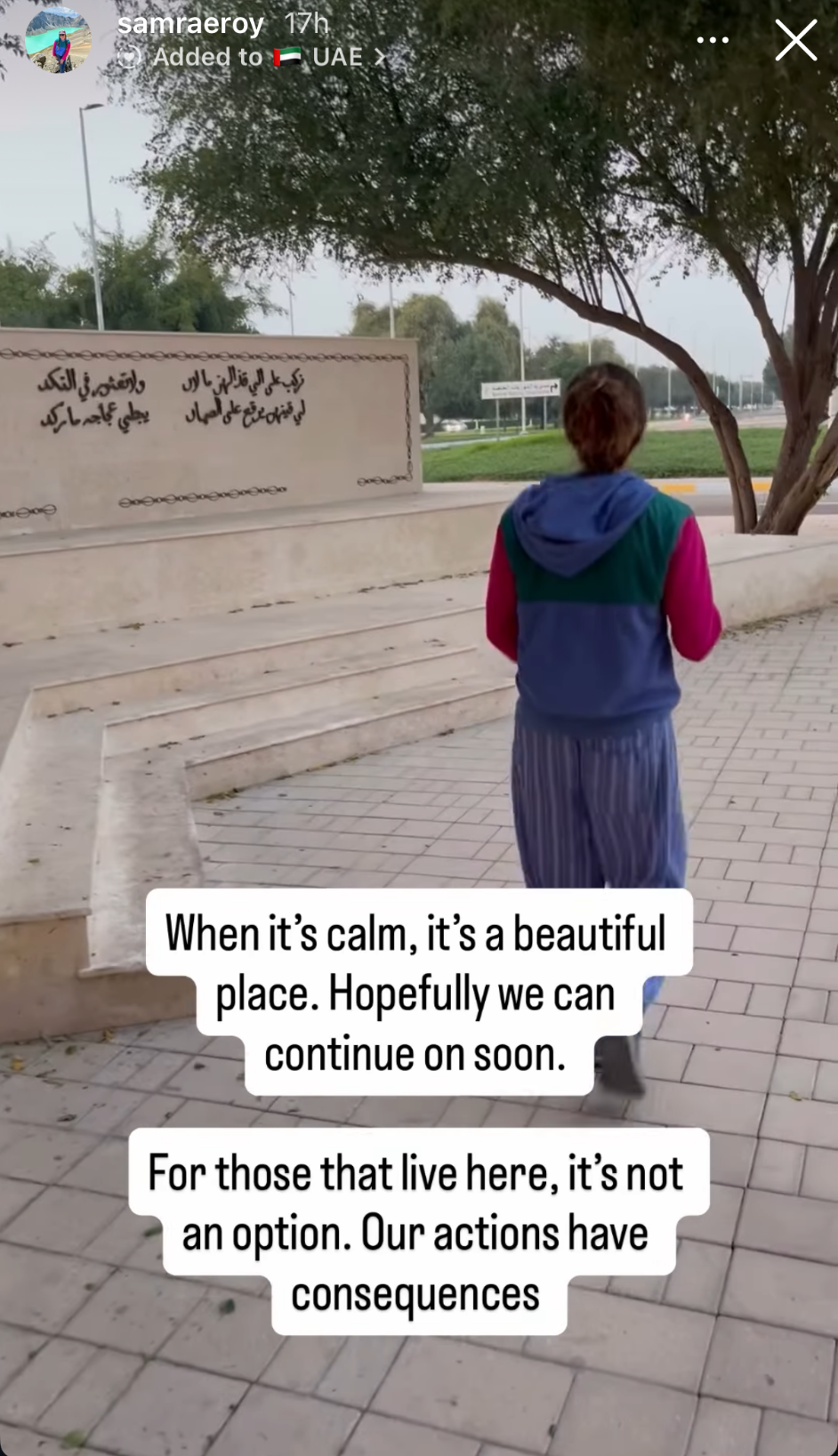 Unlike the Dubai and Doha-based influencer crowd, some of whom arranged an evacuation by private jet with the help of Saudi and Qatari officials, Roy’s travel plans don’t revolve around luxury high-rises and private flights. She was just passing through the UAE, and hoped to see the local landmarks during her layover in Abu Dhabi.