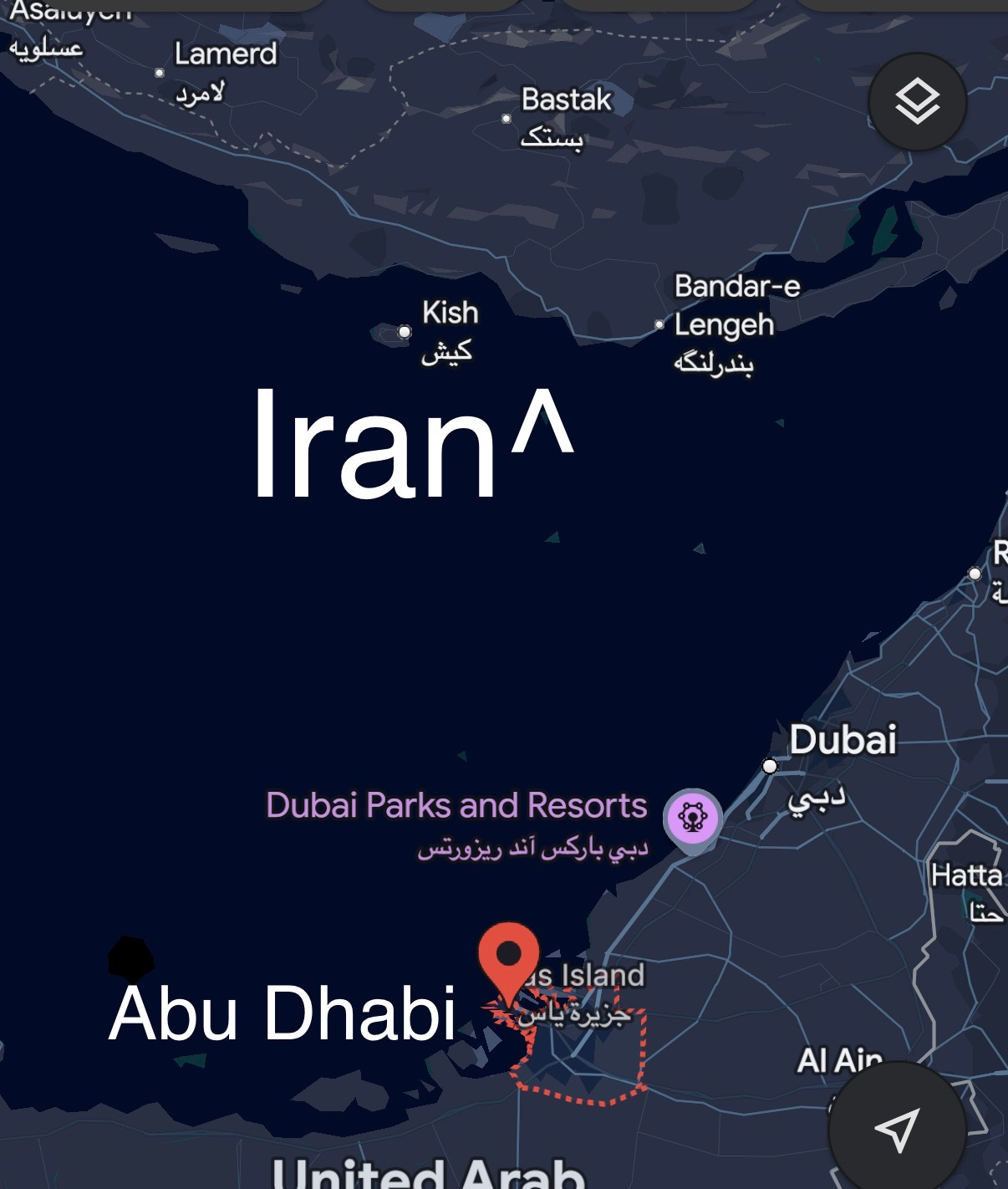 Abu Dhabi is a waterfront city on the Persian Gulf, directly across the southern shores of Iran.
