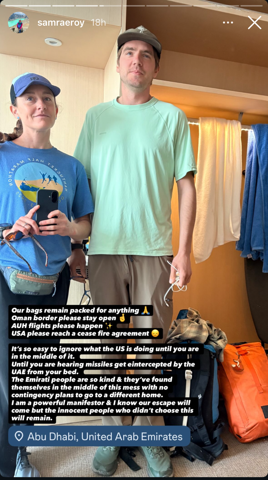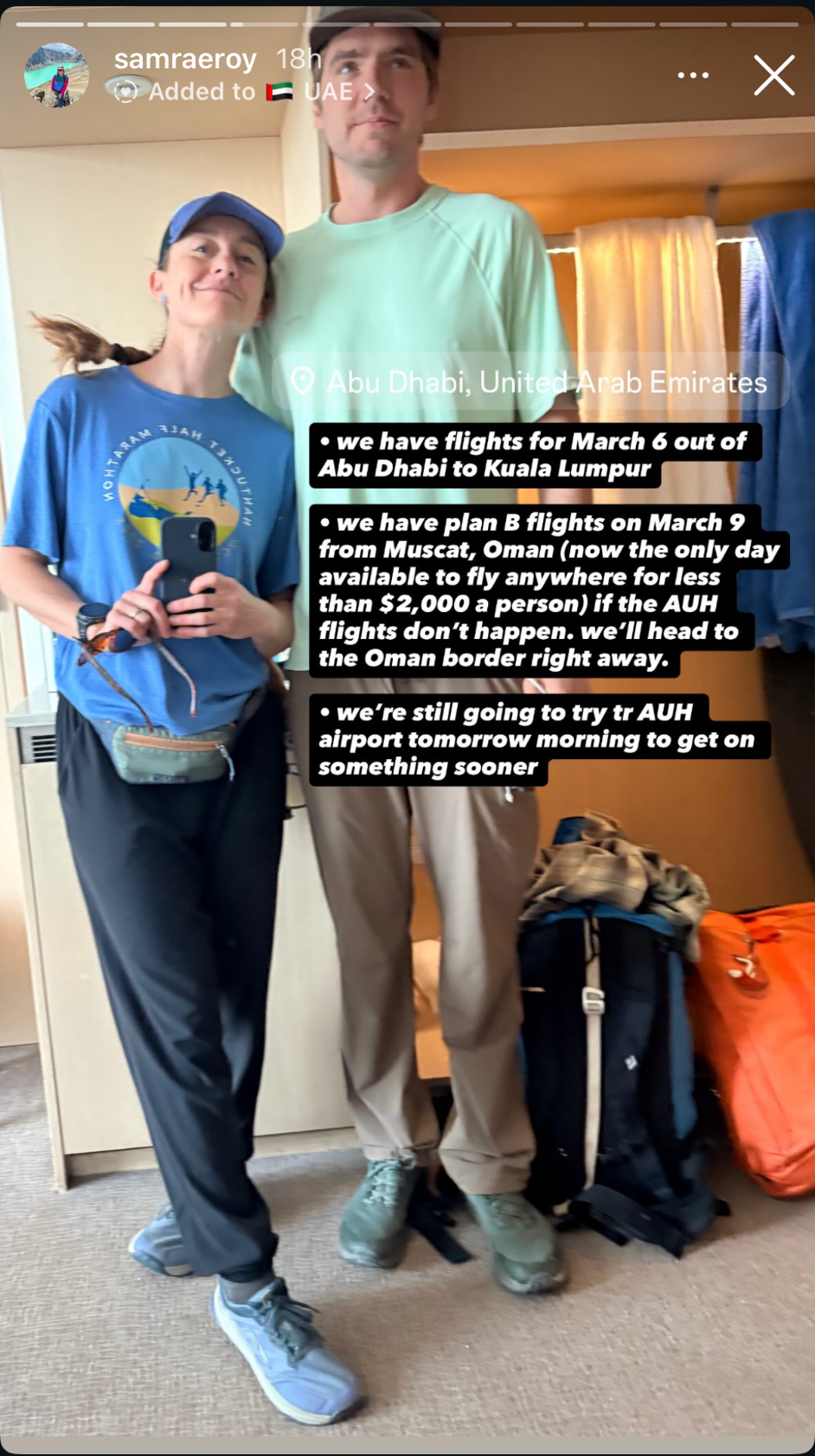 Roy describes her travel-style since 2017 as “off the beaten path”, typically wearing hiking attire and carrying backpack, Roy frequents national parks and spent weeks in Central America roadtripping “potholed roads over dicy border crossings in a manual car.” For the typical American traveler, like Roy, getting caught in the Middle East at the beginning of the U.S. war on Iran is a harrowing experience.