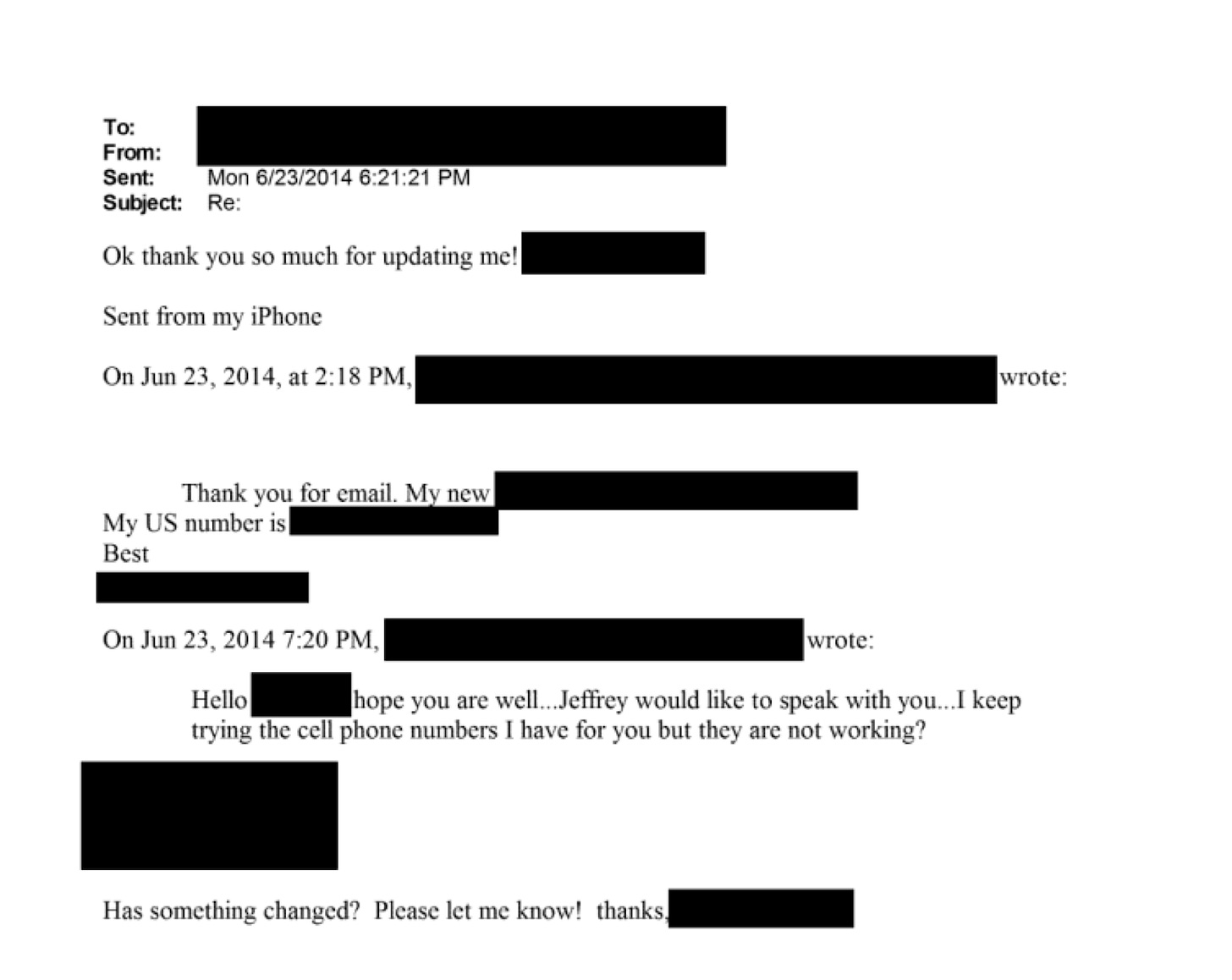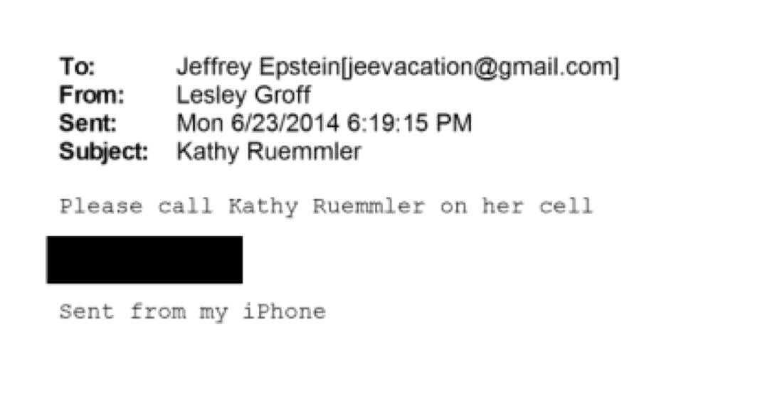 June 23, 2014 is Ruemmler’s first known contact with Jeffrey Epstein. He received a one-line email from his assistant, Lesley Geoff. It reads: “Please call Kathy Ruemmler on her cell.”