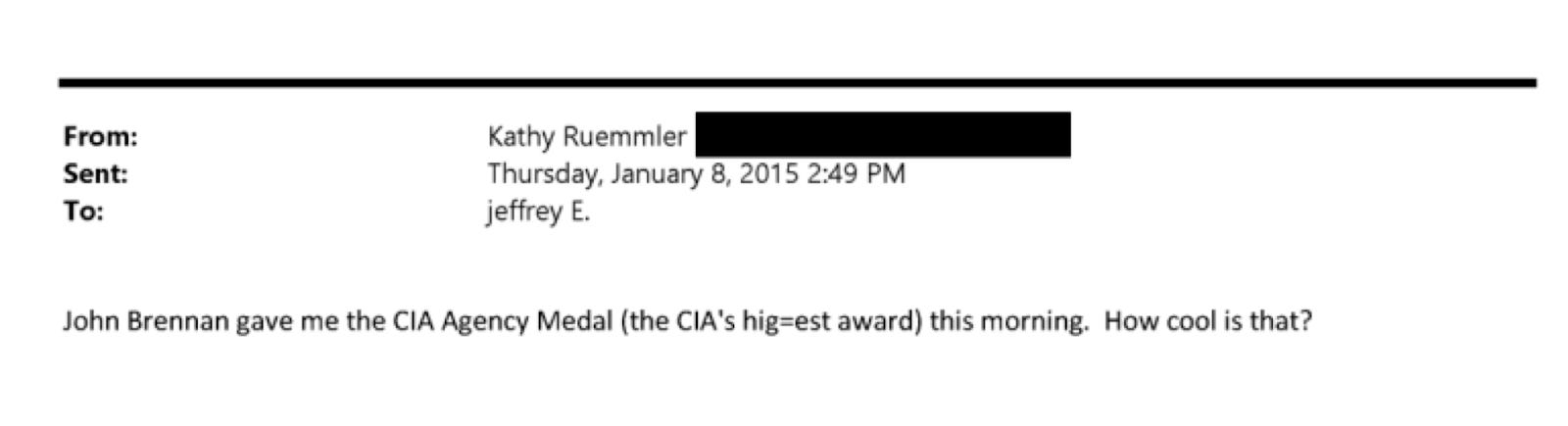 Of the 11,000+ emails sent between Katheryn Ruemmler and Jeffrey Epstein, this is a needle in a haystack. It’s from Ruemmler to Epstein: “John Brennan gave me the CIA Agency Medal (the CIA’s hig=est award) this morning.”